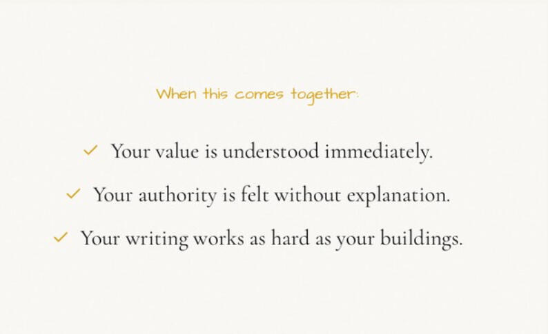 Day #1. Find Your Story— You’re Going To Hate These EmailsDay #2. Tune Your Culture— Why Visibility Without Authority Is a Trap (and How Architects Fall Into It)Day #3. Shape The Structure— Don’t Let Old Ways of Writing Let You Down In 2026Day #4. Refine Your Voice— Still Reading? Good.Day #5. Design Your Words— Still Doing 2019 Tactics?Bonus Day #1.The 7 language upgrades most firms never makeBonus Days.….. For more? Click ‘join the series’ to read more 👇🏿