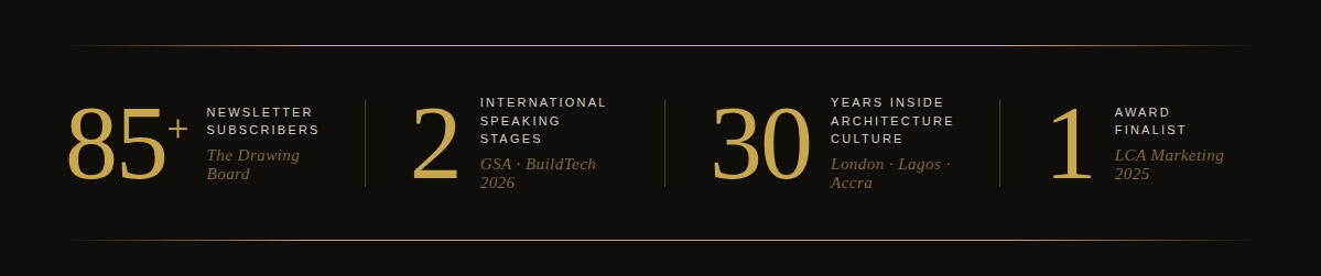 → Some clients… Tsolakis Architects · Let’s Build · FA GLOBAL · Hunters→ Featured across RIBA · LFA · WAF · IDA Design Awards · London Build · UK Stages→ Speaker at Graduate School of Architecture, University of Johannesburg→ Solo Finalist….Marketing Team of the Year, London Construction Awards 2025→ Former #1 Afrobeat & Amapiano Blogger for 16 years→ Creator of the Narrative Architecture Framework™→ London · Lagos · Accra