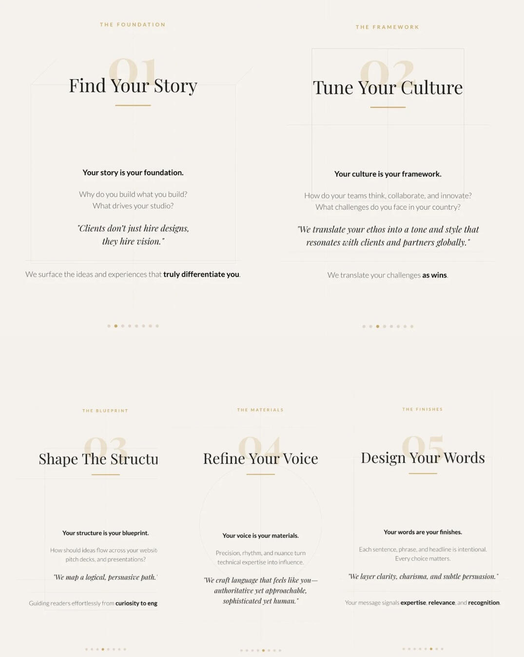 5 steps that take how your practice or studio thinks and turns it into language that earns authority, trust, and cultural relevance.- Find your story